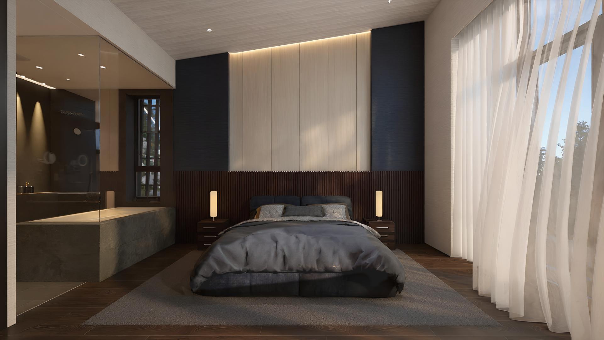 The upper floor forms the primary living level, organized into three zones. The master suite faces Mount Yotei and includes a walk-in closet, powder room, and ensuite bath separated by a glazed partition. Opposite, the living-dining-kitchen area enjoys wide views and abundant daylight, while a media room provides flexibility. A continuous balcony links the main spaces to the landscape.