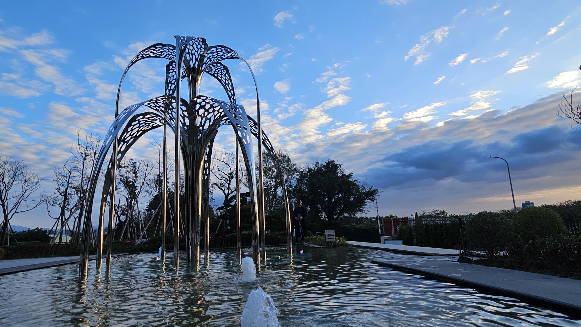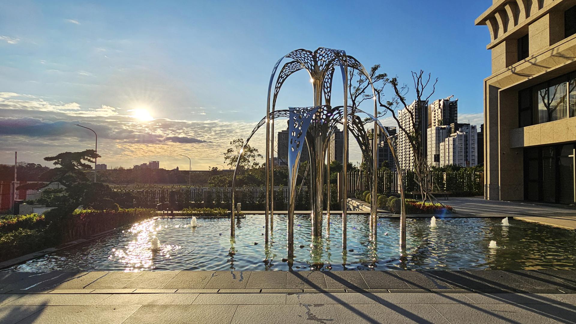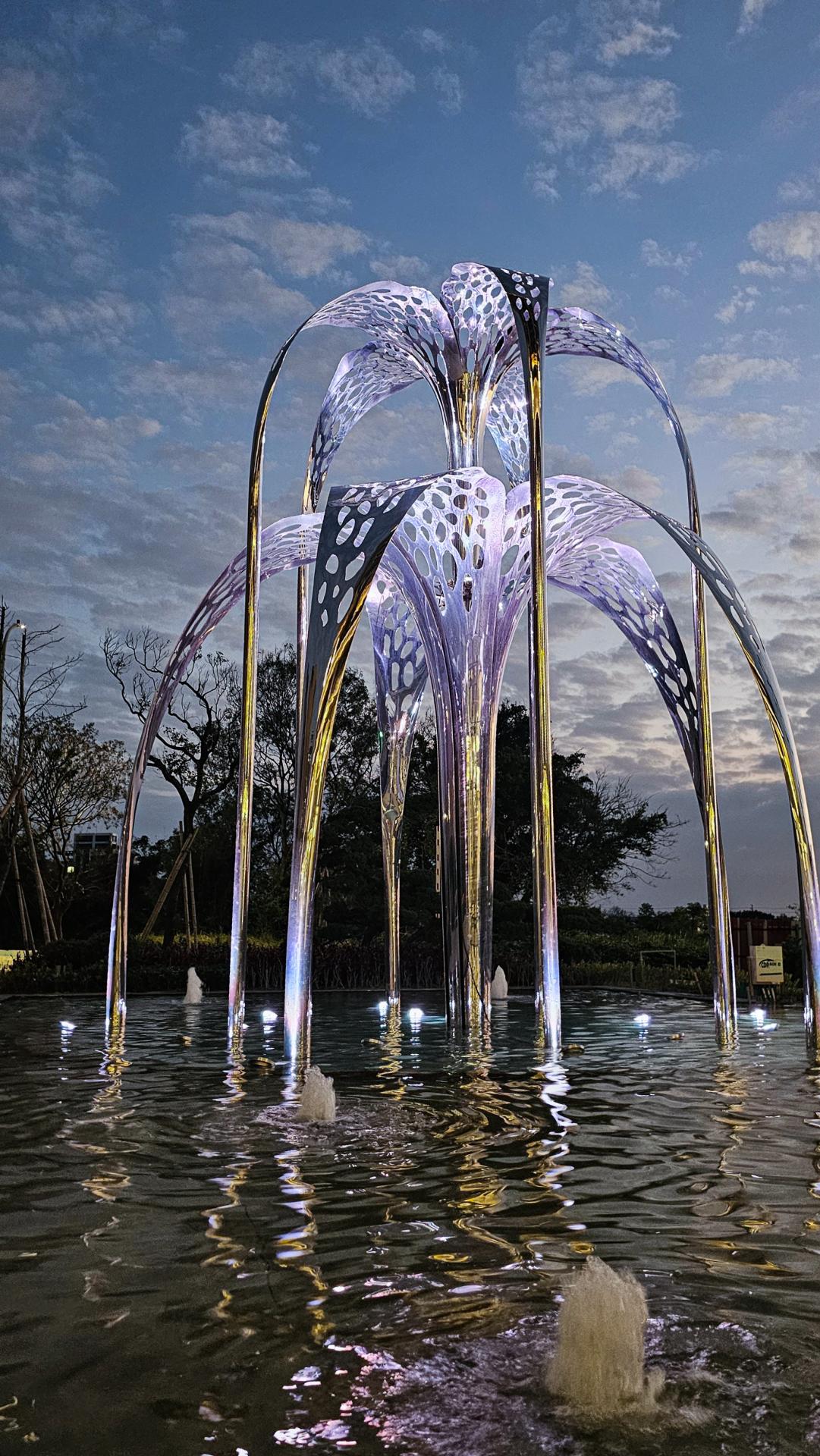 The perforated stainless steel surfaces allow natural light to penetrate and interact with the structure. During the day, sunlight filters through the intricate patterns, casting dynamic shadows and creating a luminous, airy presence. At night, integrated lighting transforms the sculpture into a radiant fountain of light. Reflections on the water surface generate a dialogue between solidity and illusion, forming a layered spatial experience that bridges material and immaterial dimensions.