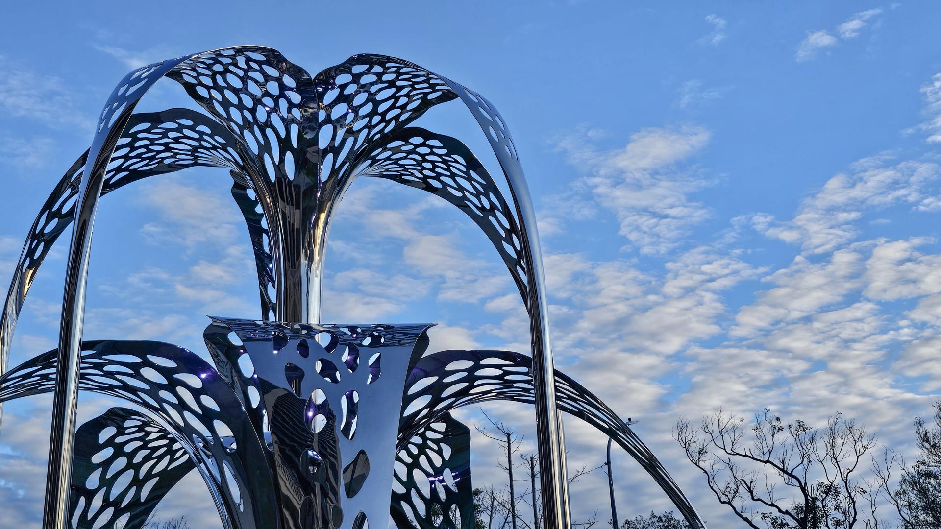 Radiant Bloom is a large-scale stainless steel sculpture composed of ten outward-extending curved elements rising from a central core. The structure evokes a perpetual fountain, symbolizing continuous vitality and the cyclical flow of life. Simultaneously, it resembles a blooming flower unfolding layer by layer, expressing harmony, growth, and renewal.