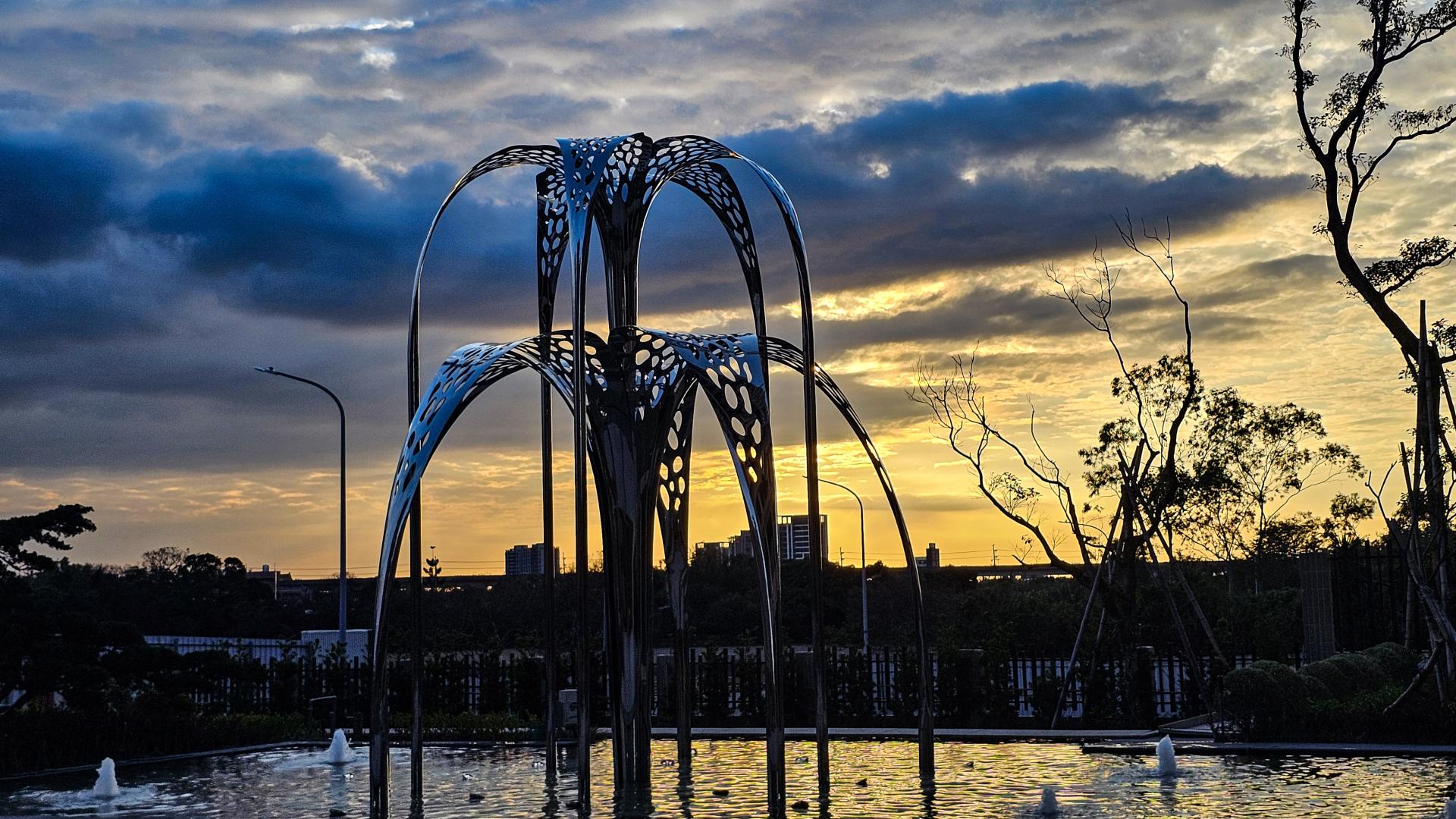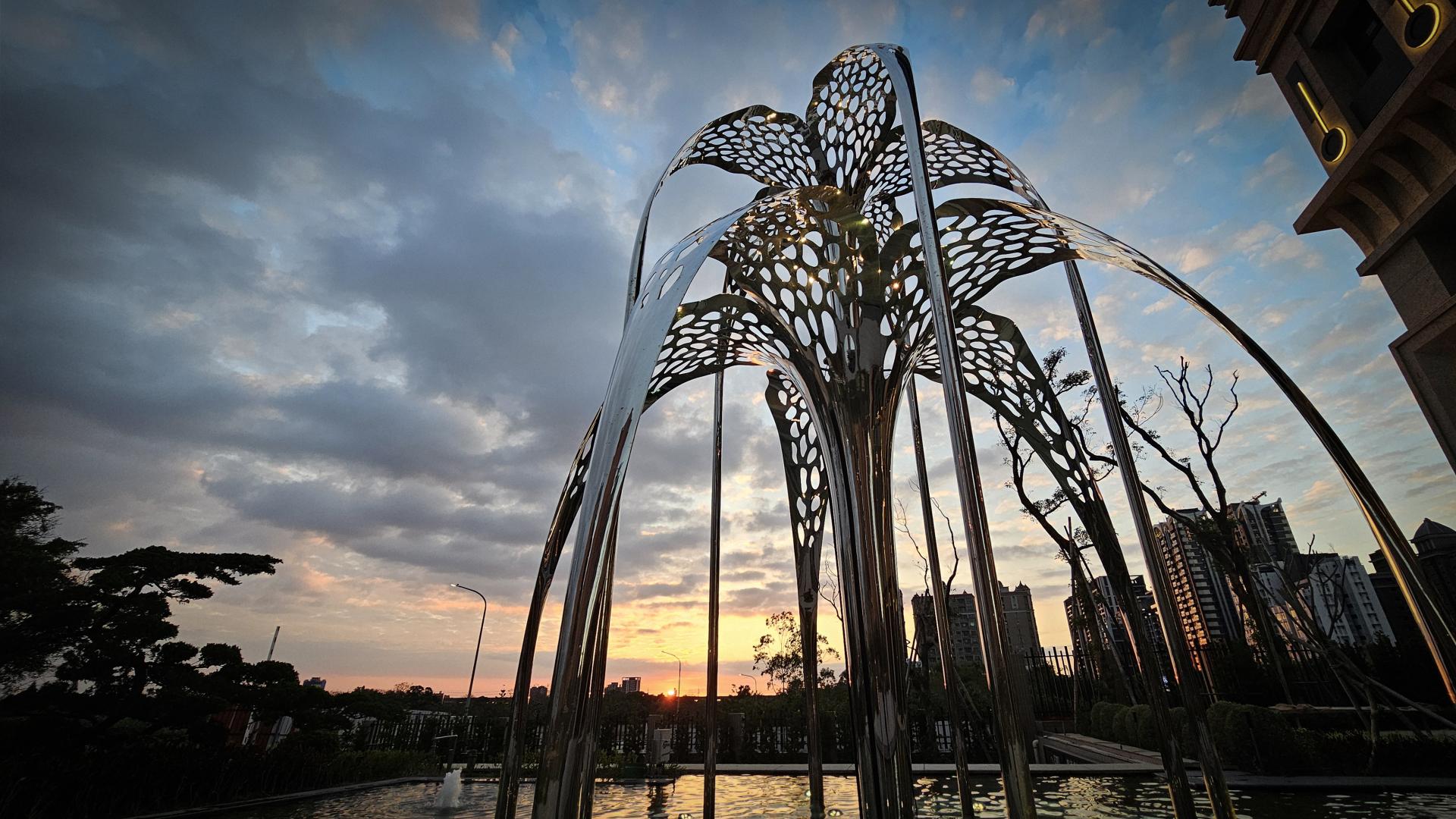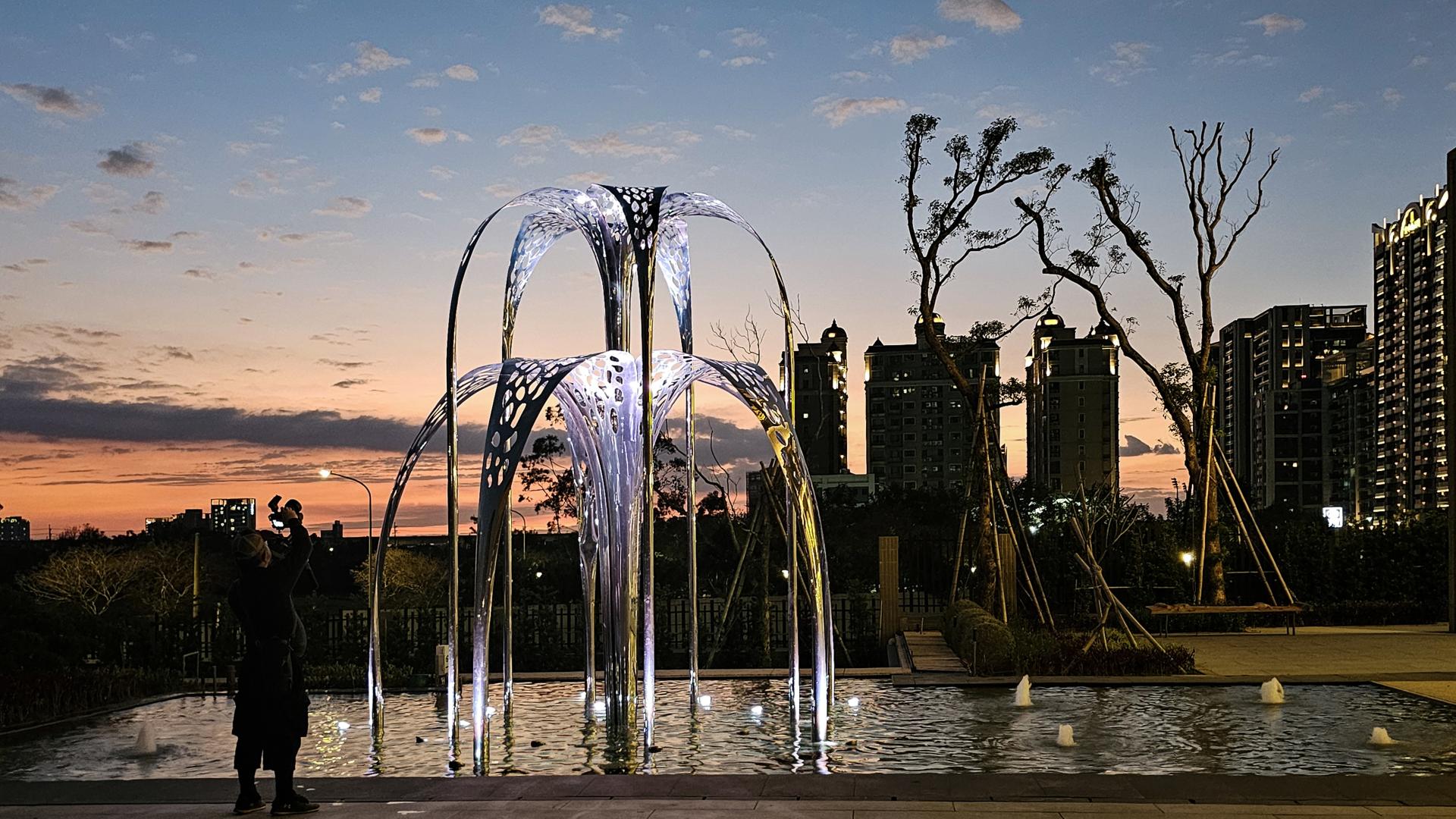 The sculpture integrates water, light, and reflective metal to create a meditative urban landmark. Rather than serving merely as a visual object, it functions as a symbolic energy field within the environment — a gesture of upward movement and outward expansion.