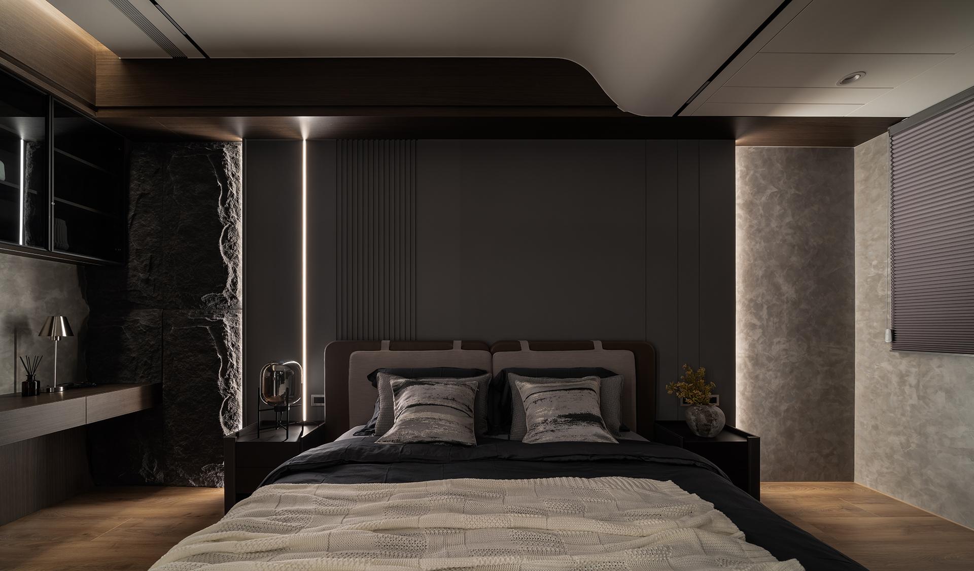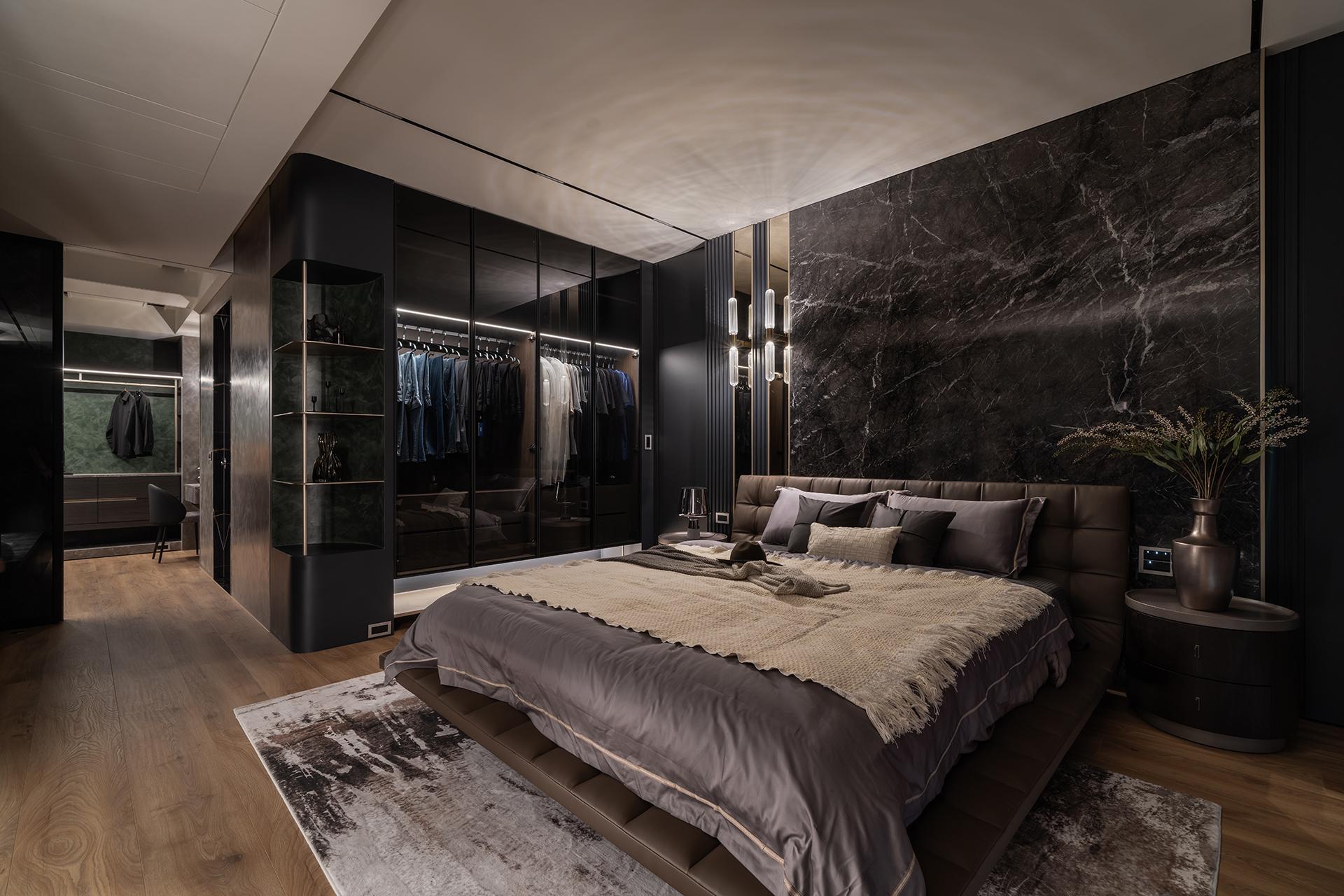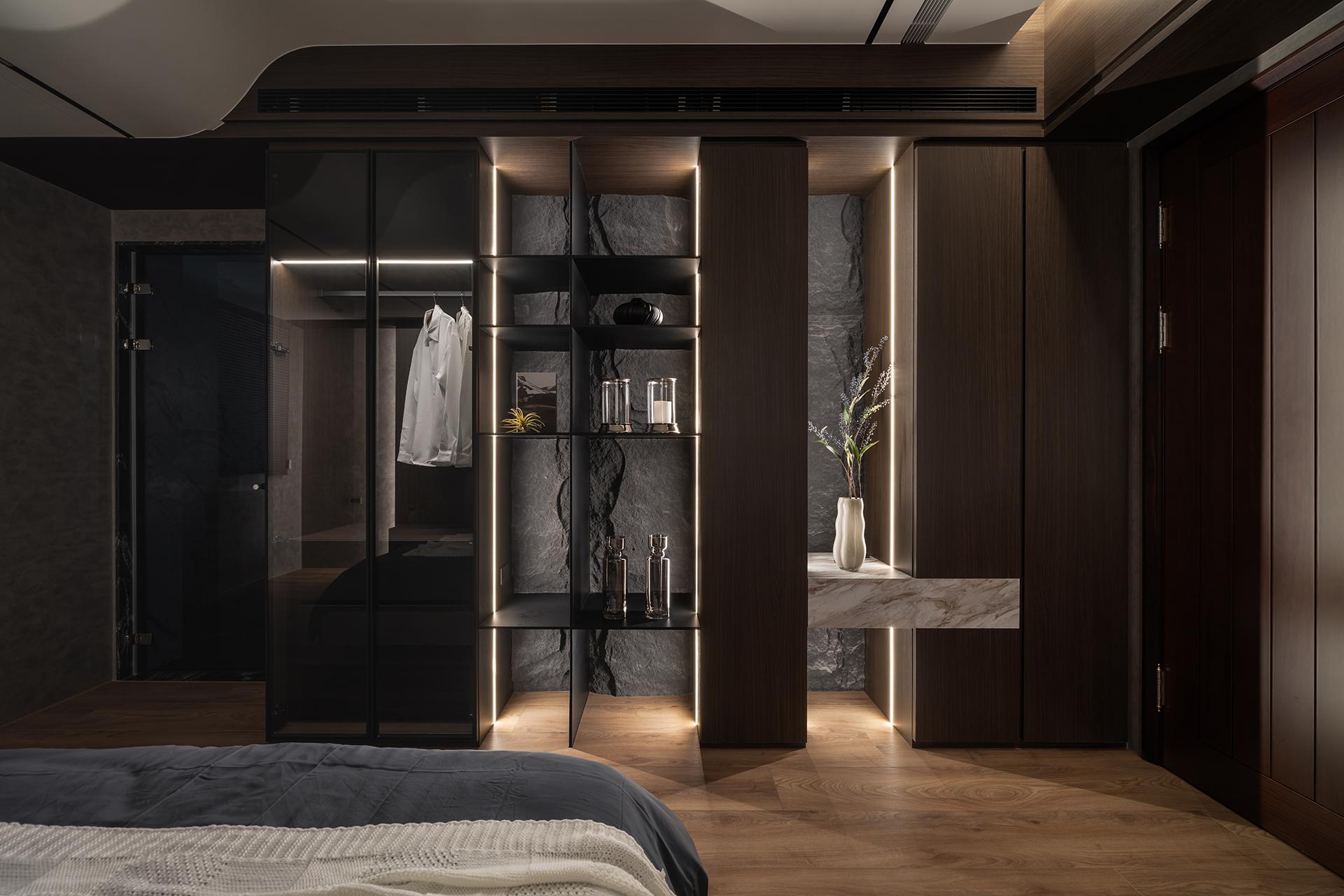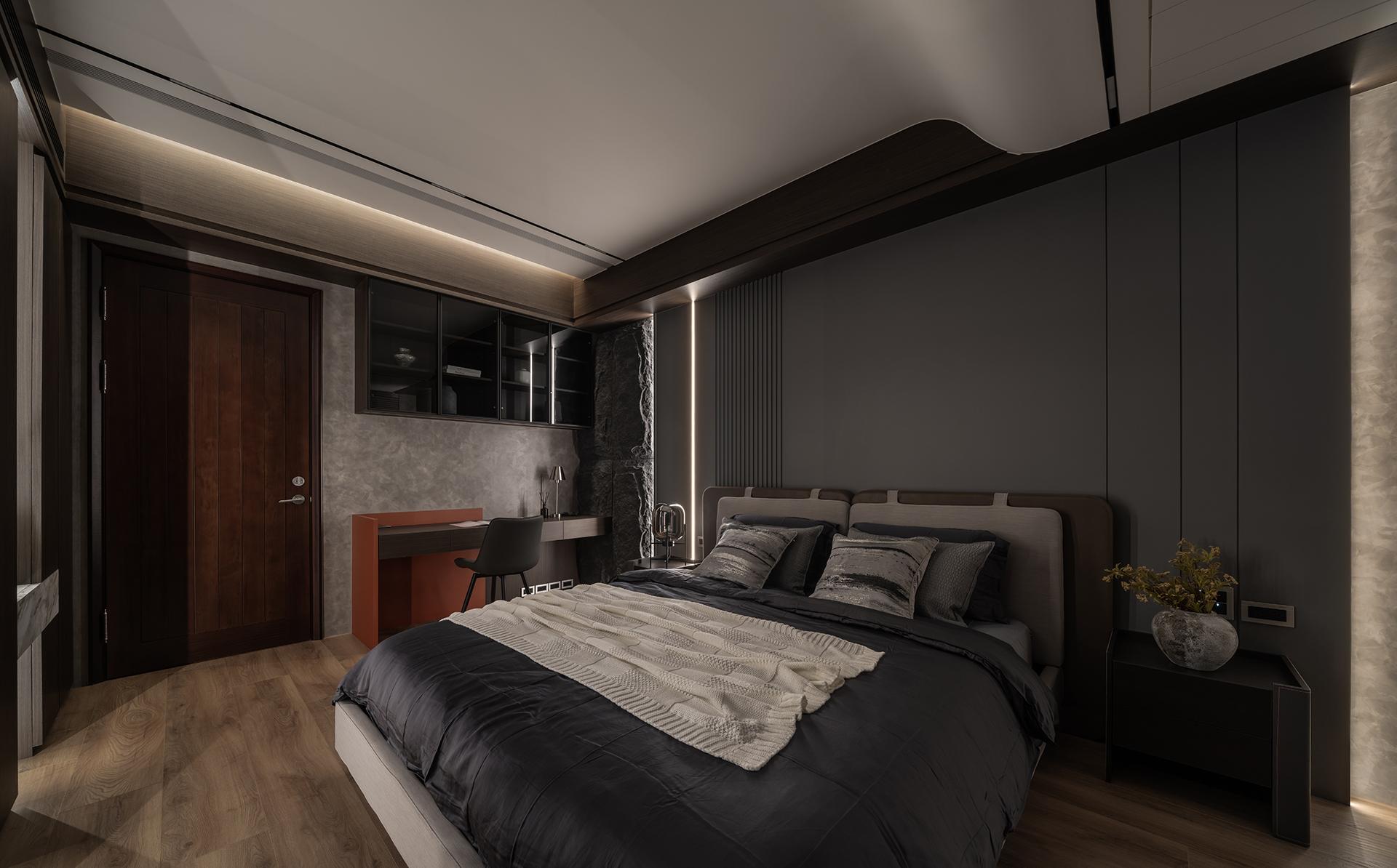 The master bedroom continues the project’s contemporary language with a softer approach. Wood flooring introduces warmth, while a muted green feature wall in the dressing area adds emotional balance to the restrained palette. Glass-fronted wardrobes, metal details, and carefully controlled lighting reveal the homeowner’s curated lifestyle and sense of order. The secondary bedroom softens structural constraints with a rounded ceiling form, accompanied by a bold accent desk, textured finishes, and stone-inspired décor, achieving a nuanced harmony between personality and comfort.