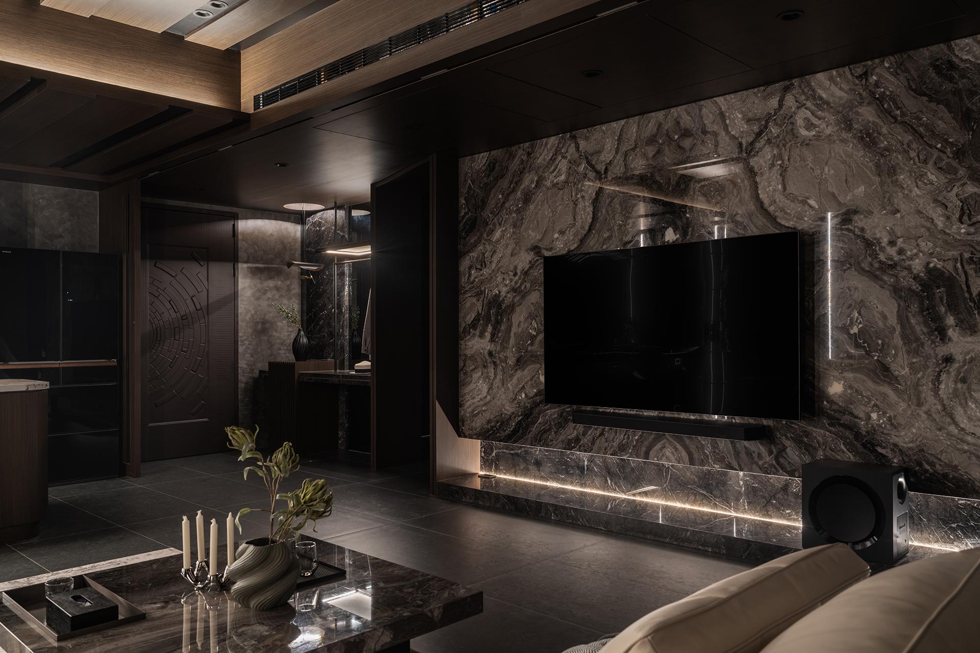 From the entrance to the open-plan living and dining area, the space features a dialogue of materials: the subtle warmth of wood grains, the textural depth of artistic wall finishes, and the bold presence of stone-patterned surfaces. An open display rack extends toward the television wall, forming a focal composition that emphasizes horizontality and spatial rhythm. Storage volumes are intentionally minimized to allow surfaces and geometry to breathe, while layered ambient lighting—light strips, sculptural pendants, and indirect wall illumination—creates dynamic shadow play that shifts throughout the day and night.
